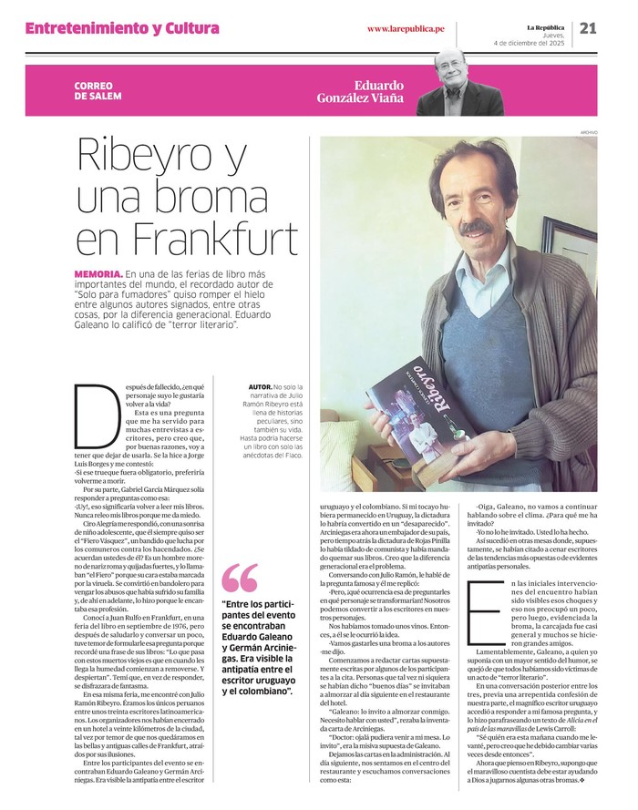 Hace no sé cuántos años nos encontramos en una reunión de escritores en Frankfurt y fui su cómplice para hacer una pasada a nuestros amigos Eduardo Galeano y Germán Arciniegas, Ahora que pienso en Ribeyro, supongo que el maravilloso cuentista debe estar ayudando a Dios a jugarnos algunas otras bromas LOS JUEVES EN "LA REPÚBLICA", GONZÁLEZ VIAÑA